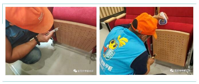 當日早上9點許,除甲醛的準備工作就緒,14名工作人員按照2人一組,分別進入宏景小學教室和教師辦公室,逐層開始每個教室、辦公室的家具除醛細節處理。兩名工作人員分工明確,一人拆下抽屜、放倒椅背、一人手持長效除醛劑噴瓶,對著桌椅均勻地噴灑藥劑,緊接著用蘸有除醛藥劑的毛刷刷抽屜、書柜邊角縫,而桌椅孔隙處,一名工作人員正在用針管注射除醛劑。