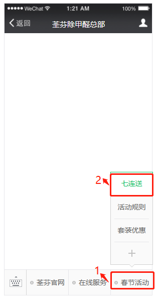 通過微信公眾號,荃芬除甲醛總部:底部菜單>春節(jié)七連送